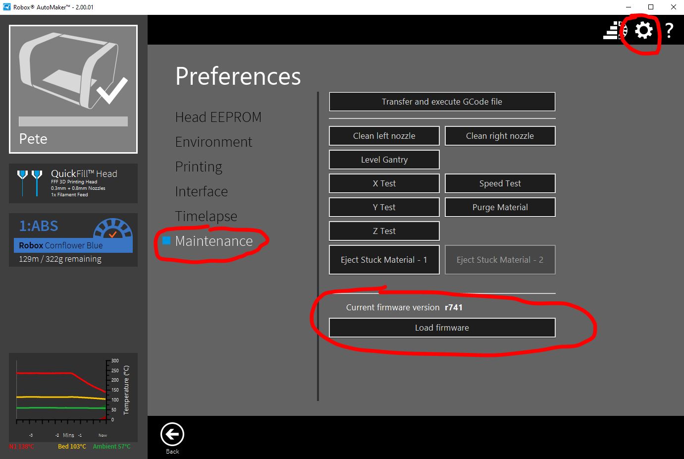 - Click the Gear icon for Preferences (top right)>Maintenance>Load Firmware